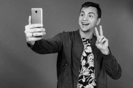 Expression session. Young man taking selfies on his cell phone with different facial expressions