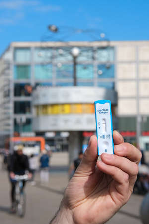 Hand hold express COVID-19 test on Alexanderplatz with shop and World Clock on the background. Schnelltest, express corona test in German , is required for shopping.