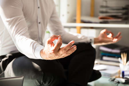 Portrait of mature businessman meditating while sitting in lotus position in office