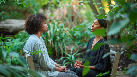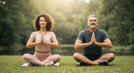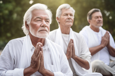 Calm meditation group outdoor mindfulness session diverse seniors serene focus peaceful breathing practice urban park