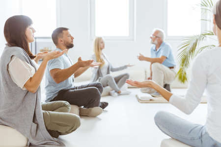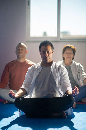 Aged people practicing meditation in gym. European coach in shirt sitting with crossed legs and holding hands in mudra. Yoga concept