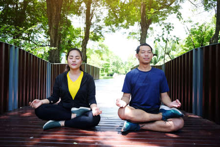 Smiling Asian couple in sportwear sitting and doing yoga for meditation for create concentration and calm the mind on wooden bridge together after exercise in the natural light garden.