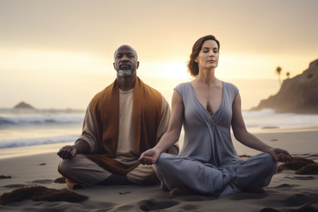 Mature couple practicing yoga at sunrise on the beach. Meditation as a lifestyle to unload the mind after living in modern society.