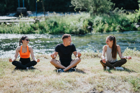 Group of friends practicing yoga outdoors in a peaceful natural environment