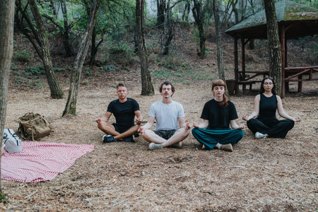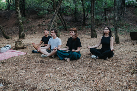 Group of friends meditate in a forest clearing during a peaceful outdoor mindfulness session
