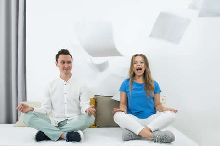 Man and woman practice yoga and meditate for relaxation and balance of life on a mat in a room at home. sports concept.