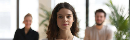 Hilarious manager looking at camera. Colleagues standing behind her. Portrait