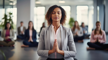 Calm businesswoman professional taking break meditating sitting at table in office meeting ignoring loud colleagues discussing brainstorming argue mindful healthy female boss doing yoga no stress zen