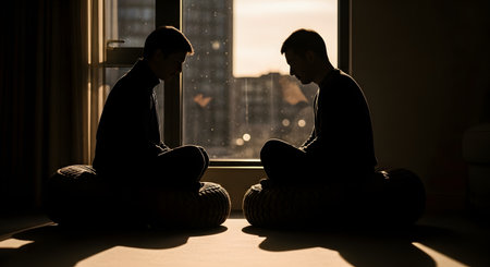 Two men sit cross-legged on bean bag chairs facing each other in silhouette against a large window with a city view. The warm light suggests sunset, creating a mood of quiet conversation, meditation, or deep connection.
