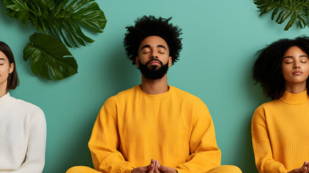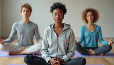 Three individuals, a Black woman in a gray hoodie, a Caucasian man in a light gray top, and a mixed-race woman in a blue shirt, are meditating in a serene yoga studio. Their peaceful expressions and relaxed postures create an atmosphere of calm and mindfulness, highlighting the beauty of diversity in wellness practices.