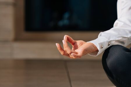 Hands women closeup in stylish business attire to hold a pose namaste. Yoga in the workplace in the office.