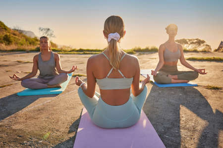 Full length yoga women meditating with legs crossed for outdoor practice in remote nature. Diverse group of mindful active friends bonding and balancing mental health. Young focused serene zen people