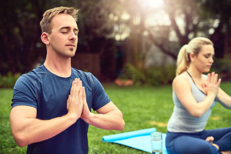 Focused on finding peace. a young couple practising yoga together outdoors.