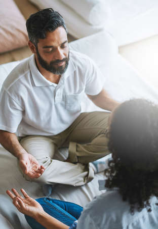 Finding their zen together. Shot of a relaxed couple meditating together at home.