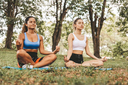 Happiness beautiful friendship young woman yoga exercise smile portrait at garden park.