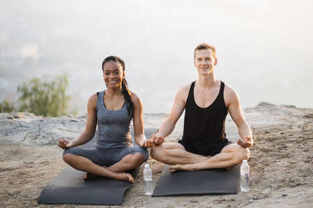 Young multicultural couple in sport outfit sitting in lotus position and meditation on yoga mat outdoors, smiling to camera. Concept of yoga, fitness, breathing practice and peacefulness.