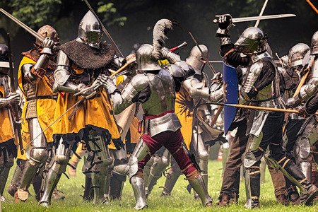 Fight between the pedestrian knights in a heavy armor in a medieval castle against a stone wall , Vyborg,Russia, july-31