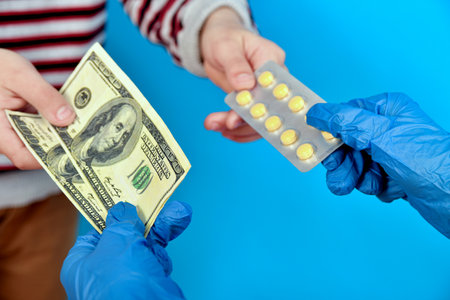 Hand of a doctor in blue glove exchanges medicine for money, a patient giving money for pills in blister, paid medicine and corruption concept, close up.