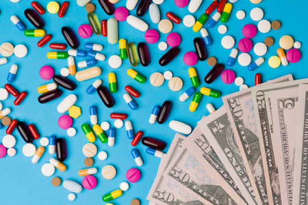 Money and pills of different colors on a blue background. The rise in the cost of medical care. The concept of insurance medicine, insurance, high cost, high cost of drugs.