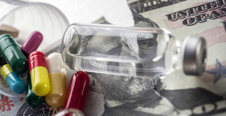 vials with different substances over dollar, concept of copayment