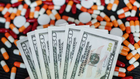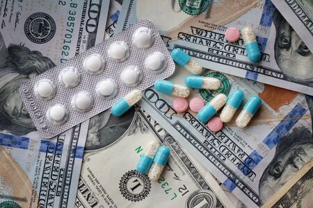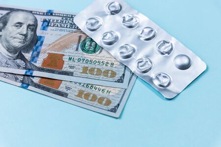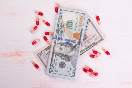 Medicine pills and capsules with money dollar. Cost of the healthy life. Expensive medicine