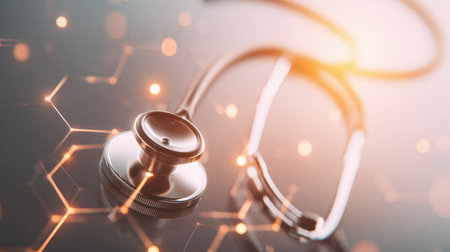 Health protection. Medical and health care concept.Studio macro of a stethoscope and digital tablet with shallow DOF evenly matched abstract on wood table background copy space