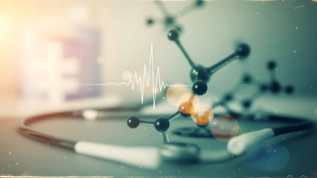 Healthcare concept - stethoscope and white pills on blue with diagrams, modern, medicine concept