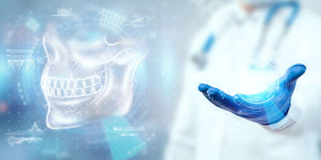 Medical poster, human skull anatomy, jaw x-ray, teeth snapshot. The doctor looks at the x-ray hologram of the jaw. Dentist, orthodontist, toothache, bite