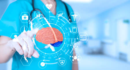 Doctor neurologist in a medical uniform points a finger at the brain with medical icons, birth defects of the brain. Soft blurred hospital background. medical poster. high quality photo