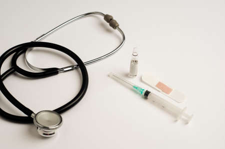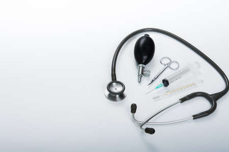 Stock photo of a stethoscope, a scissor, syringes and tablets on a white background. There is nobody on the picture.
