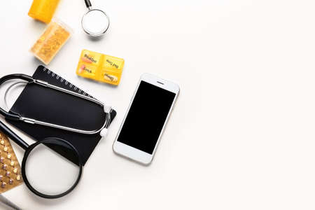 Mobile phone and medical supplies on blue background. Telemedicine concept