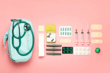 Stethoscope, gloves, medical instruments on a pink background with a copy space.