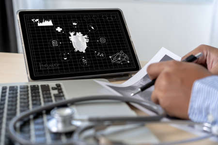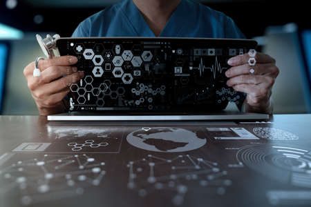 Accurate diagnosis appropriate treatment medical concept.Doctor hand working with stethoscope and laptop computer digital tablet with virtual dashboard interface
