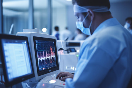 Surgeon monitoring patients heart rate with electrocardiogram on medical heart rate monitor screen