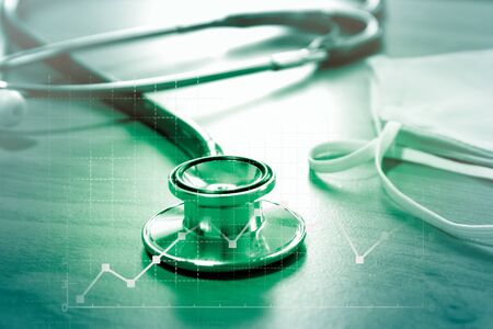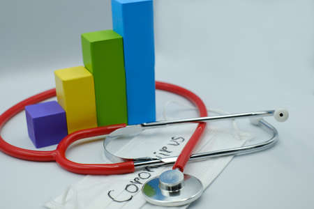 Coronavirus impact to economic concept. Coronavirus case, symptoms and outbreak. Red Stethoscope, bar graphs and coronavirus(COVID-19) text on safety breathing masks. The impact of coronavirus to healthcare, travel and business