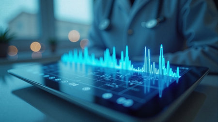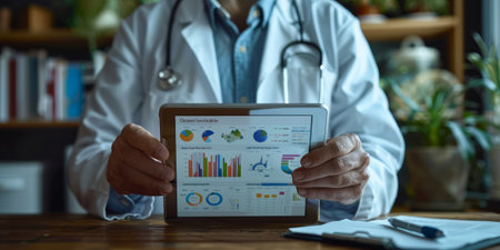 Doctor holding digital tablet displaying medical charts and graphs, symbolizing modern healthcare, data analysis.