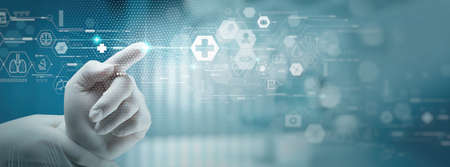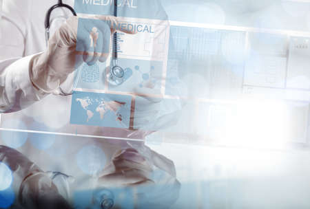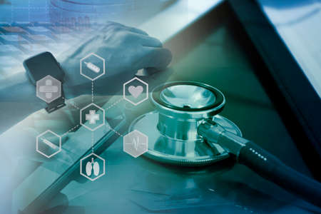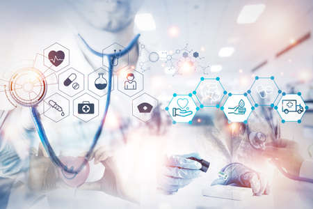 Medical technology concept,smart doctor hand working with modern computer in hospital office with virtual icon diagram