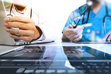top view of Medicine doctor hand working with modern computer and digital tablet with digital medical diagram on wooden desk as medical concept