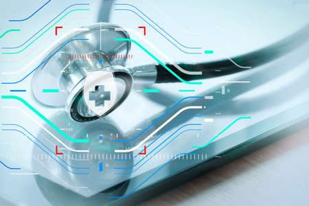 Data Security system Shield Protection Verification concept.Doctor hand working with stethoscope and laptop computer digital tablet with virtual dashboard interface