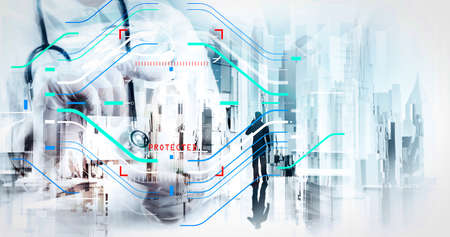 Health protection. Medical and health care concept.Double exposure of smart medical doctor working with abstract city as concept