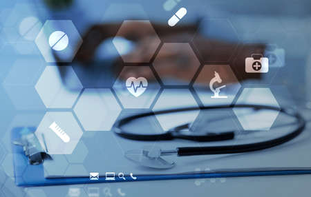 Healthcare and medical conceptual icons over stethoscope on medical chart, collage