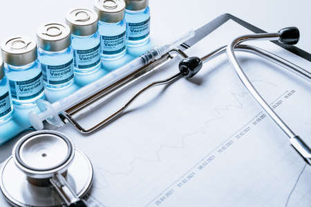 Doctor or scientist with a stethoscope holding vaccine, measles, virus vaccine shot for diseases outbreak vaccination, vaccine Concept fight against virus