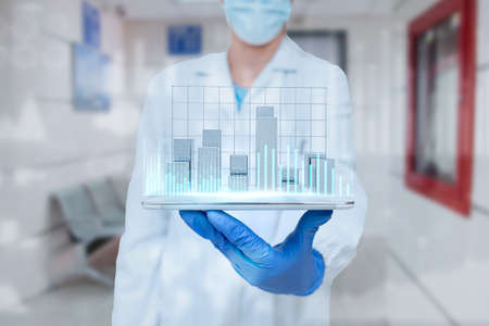 Statistics covid. Doctor stethoscope, hospital healthcare infographic charts and analytic medical statistics on hospital background. Global economy recovery after Covid 19 concept