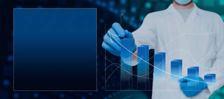 Healthcare business graph data and growth of investment, Doctor hold stethoscope and analyzing medical examination report, Virus pandemic develop attention healthcare and rising growth in hospital.