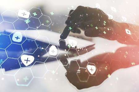 Creative concept of abstract medical illustration and finger clicks on a digital tablet on background. Medicine and healthcare concept. Multiexposure