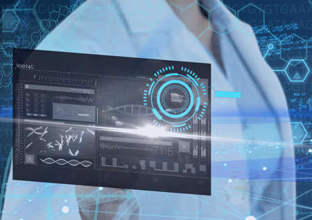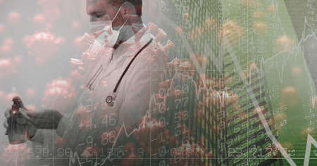 Digital illustration of data, statistics and graphs, macro Covid-19 cell over Caucasian male scientist wearing protective clothes. Coronavirus Covid-19 pandemic concept digital composite