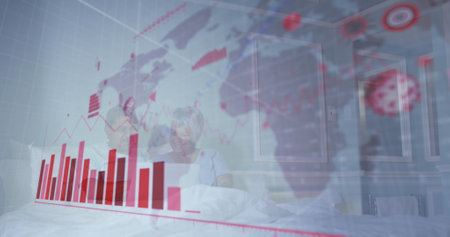 Image of statistics recording and covid 19 cells over world map and senior couple. global covid 19 pandemic, health and medicine concept digitally generated image.