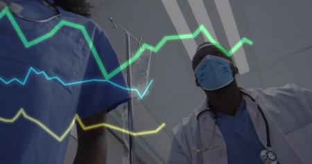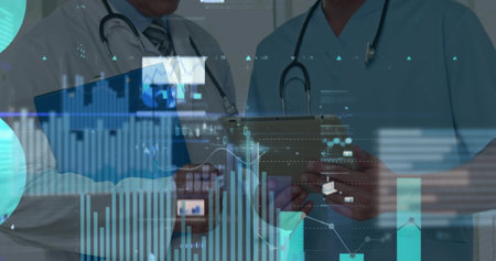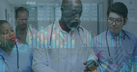 Image of financial data and graphs over midsection of diverse male doctors. Medicine and finance concept digitally generated image.