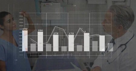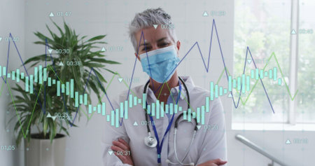 Statistical data processing over portrait of caucasian senior female surgeon wearing a surgical mask. Medical healthcare and technology concept