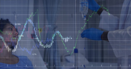 Doctor adjusting IV fluid bag beside patient bed in hospital room, with data chart overlay. Medical, healthcare, diagnostics, professionalism, clinical, treatment, technology